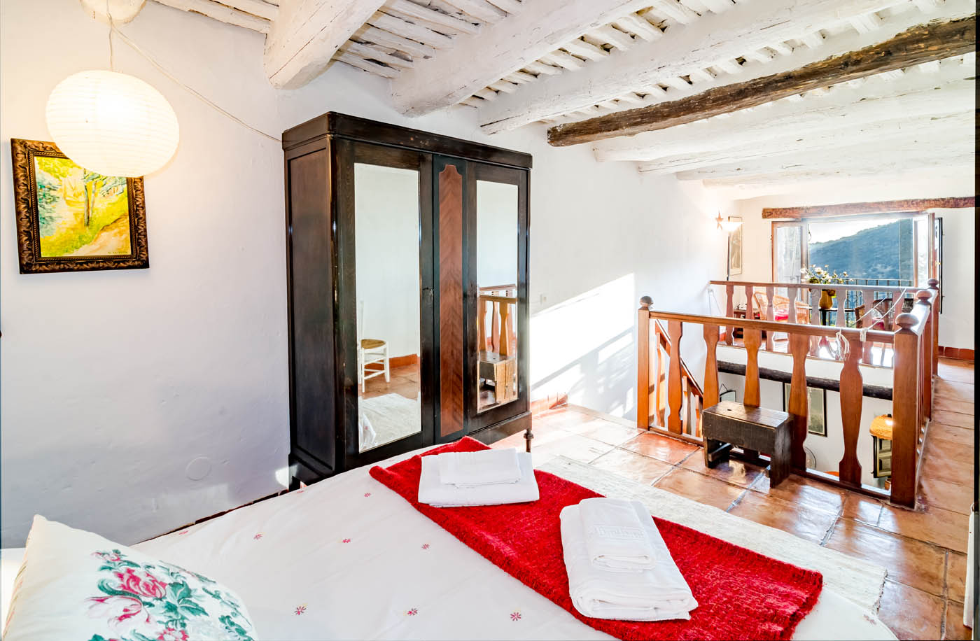 Una escalera de madera conduce hasta la planta de arriba, en forma de galería desde donde podemos ver toda la planta de abajo. El piso superior contiene la cama doble y enfrente un pequeño espacio con amplia ventana, donde sentarse a charlar y contemplar las vistas. Desde aquí, no sólo se puede permite ver la magnitud del valle, sino las lejanas montañas de la cordillera del Rif, en Marruecos en días de claridad atmosférica.