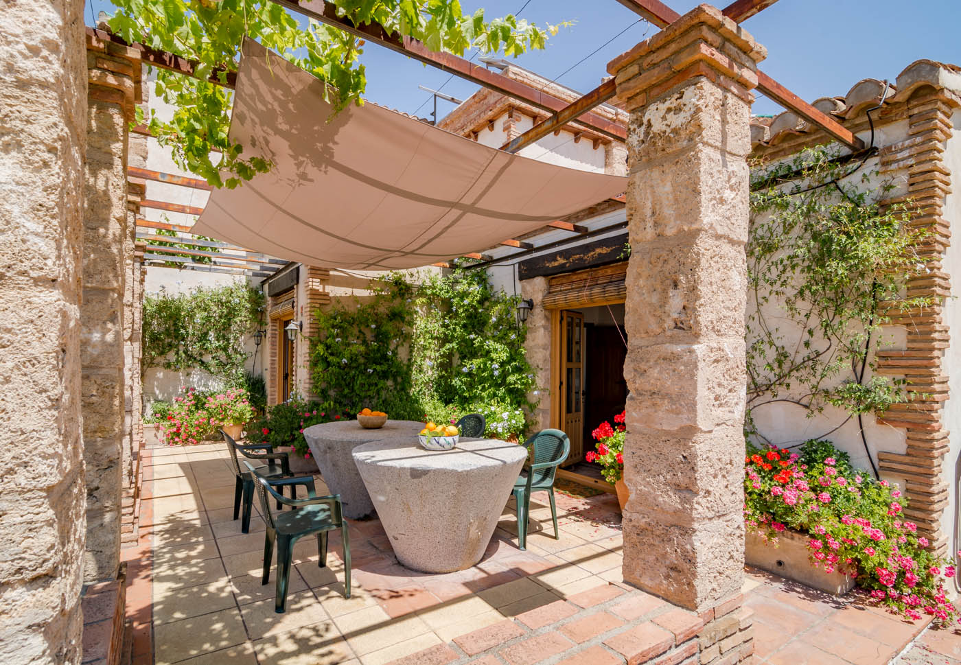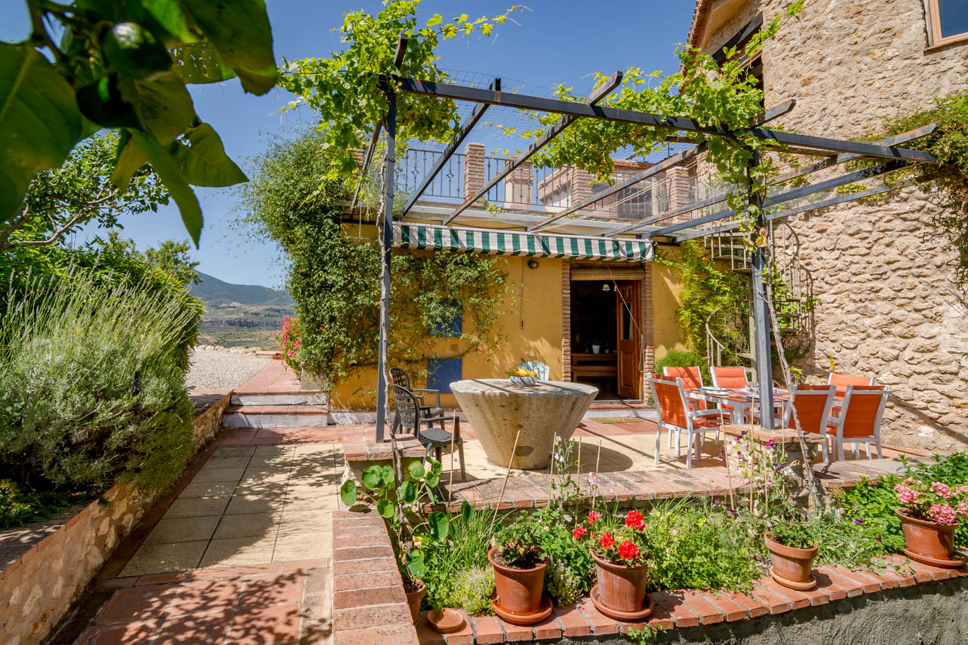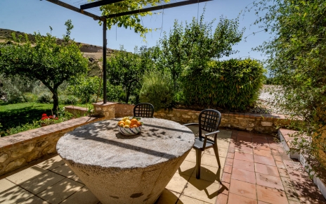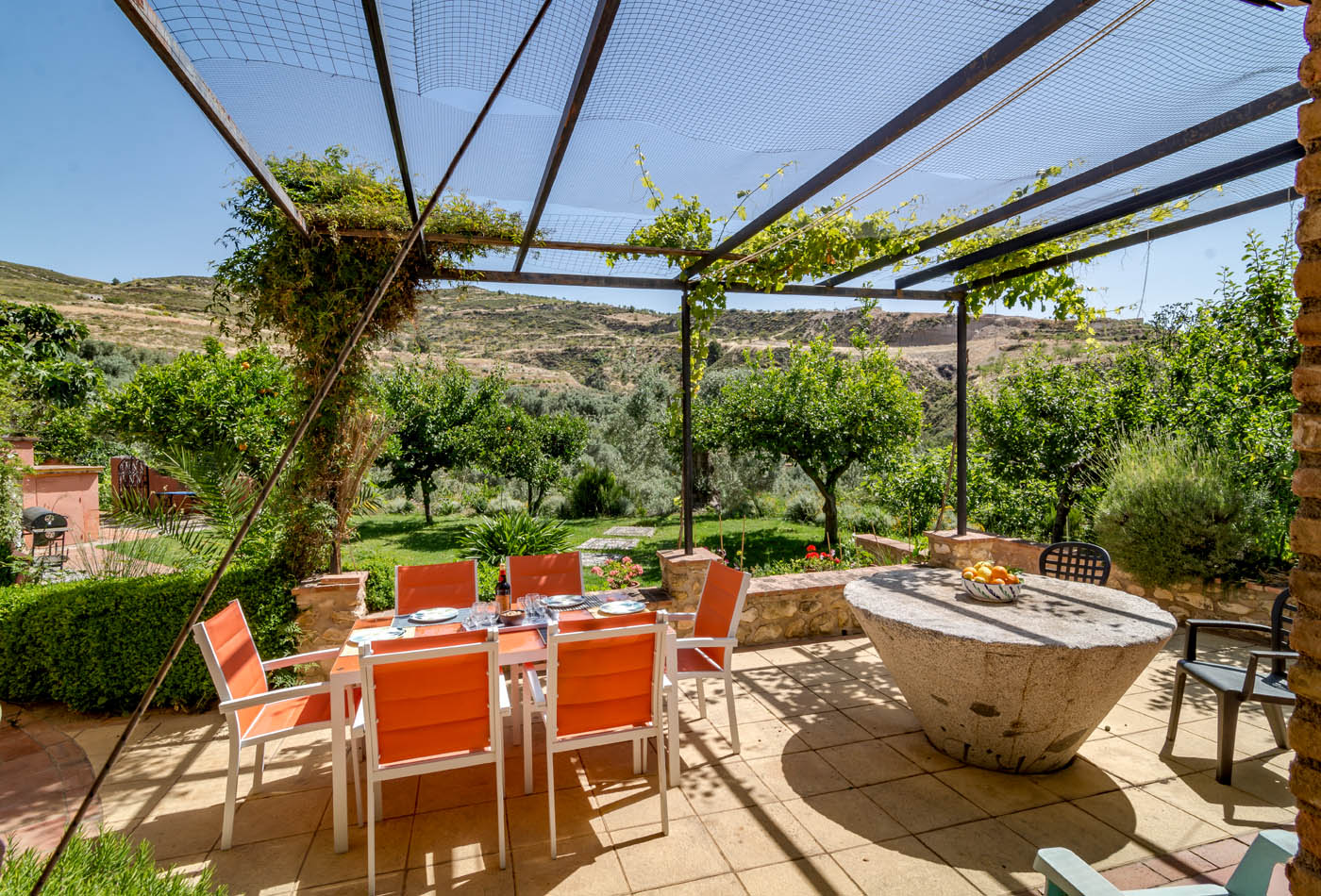 Una serie de diferentes terrazas miran en todas direcciones. Las bonitas pérgolas con sus toldos ofrecen espacios sombreados en las calurosas tardes de verano, los senderos se abren camino hacia la piscina, y las frutas de temporada cuelgan pesadas esperando ser recolectadas.