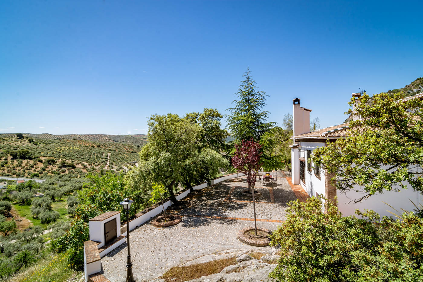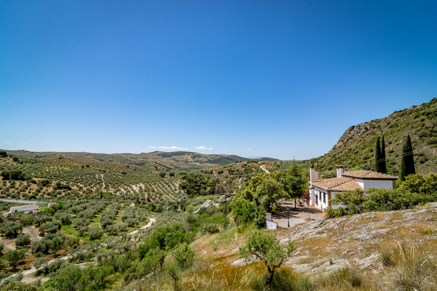 We stayed at El Mirador for 2 weeks in late May early June.The property can only be described as magical.Set on a ridge overlooking fields of olive trees as far as the eye could see.We loved the house and found that the ceiling fans were more than adequate in keeping the place cool with temperatures in the low 30's.The approach road can be a little challenging at first but becomes easier over time. The grounds are truly extensive with a beautiful pool in the lower garden. Our granddaughter loved collecting the eggs in the morning and releasing the doves.One highlight was seeing Mouflon [wild sheep] eating the fallen apricots from the trees.We all enjoyed eating meals on the various patio areas surrounding the property. After a slight hiccup with an earlier property we found the booking process with Rustical Travel to be first class and would have full confidence in using them again.The hosts Fernando and Alejandra were there to greet us on arrival and were extremely helpful throughout our stay.First class!!"