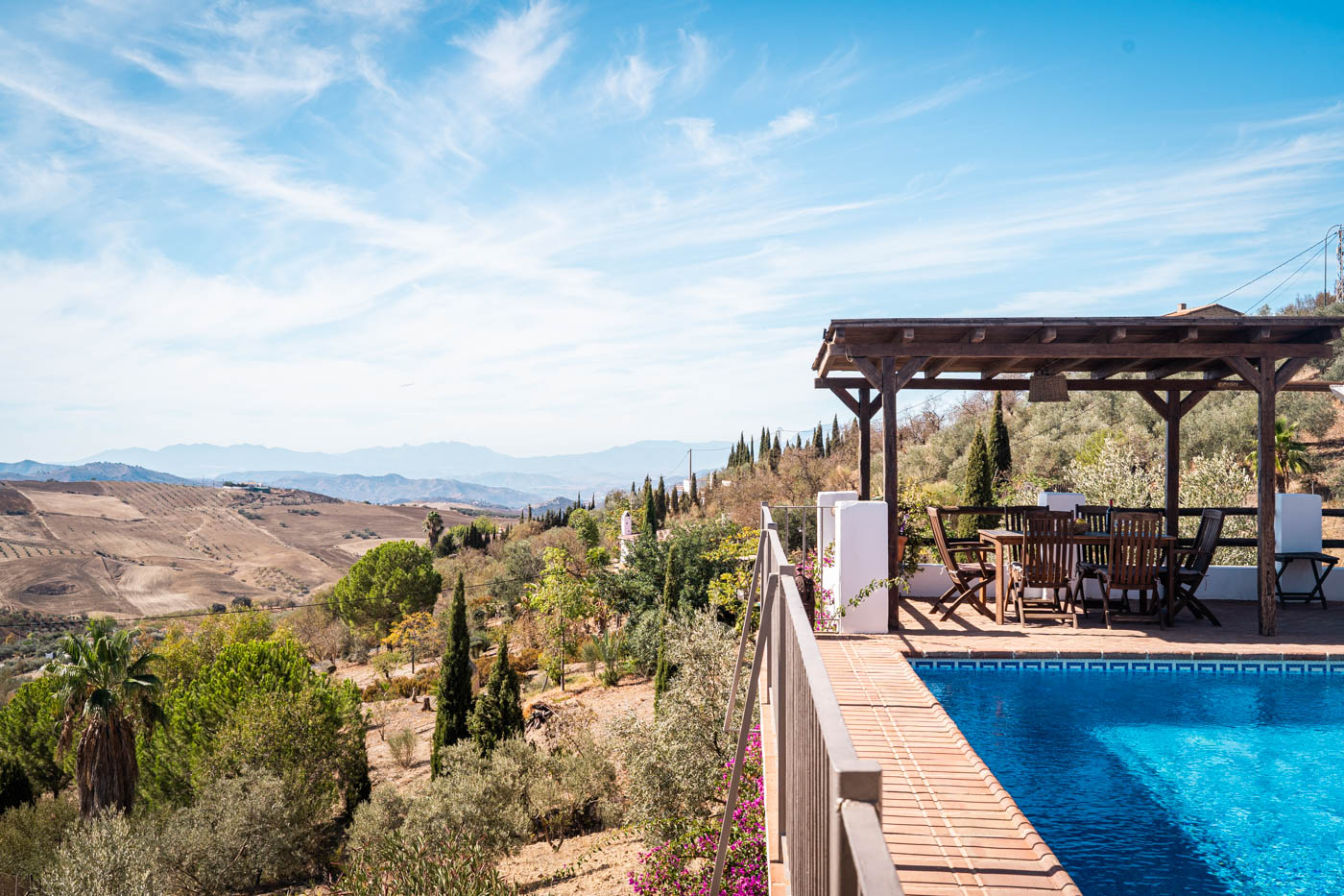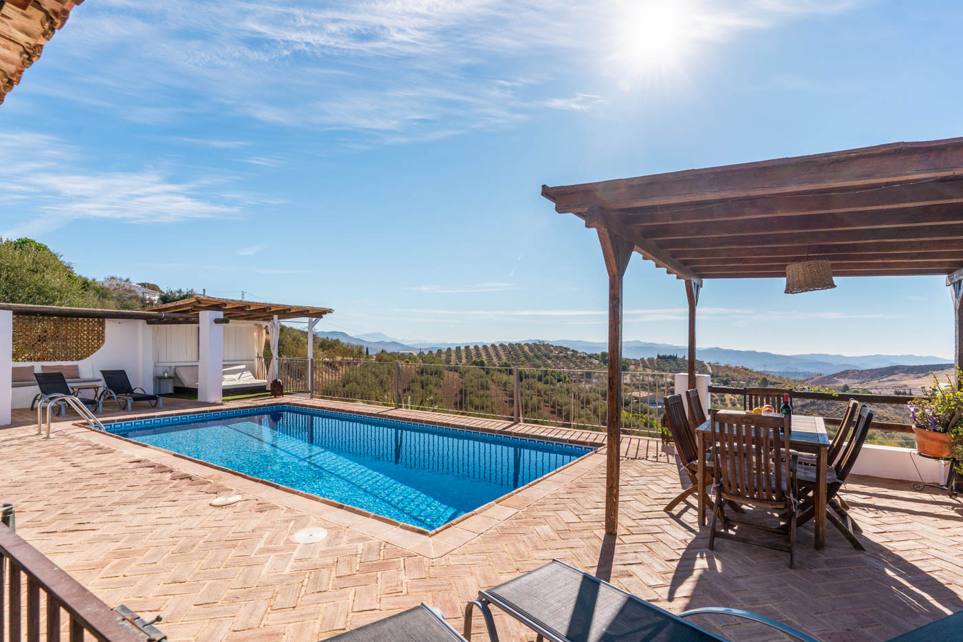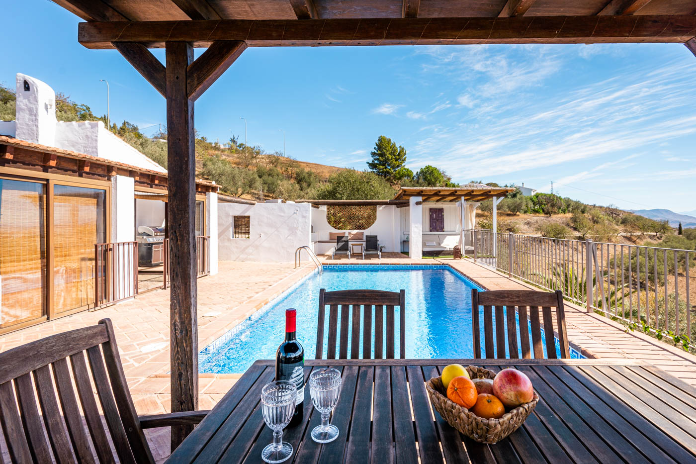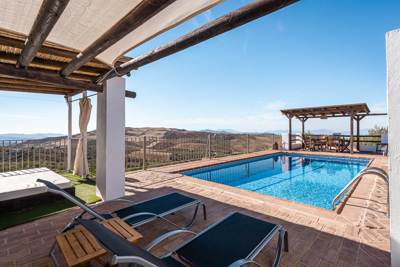 La terraza de la piscina no solo tiene una pérgola sombreada (amueblada para cuatro personas), sino que desde ella se disfruta de una vista espléndida hacia el oeste, hasta la Sierra de las Nieves. Es poco probable que uno se canse de contemplar esas colinas onduladas y plantadas de olivos. Las puestas de sol son espléndidas. Si desea cocinar en la terraza, se proporciona una barbacoa a gas.
