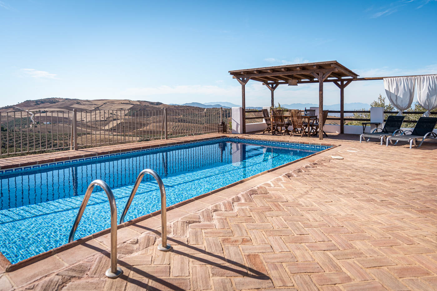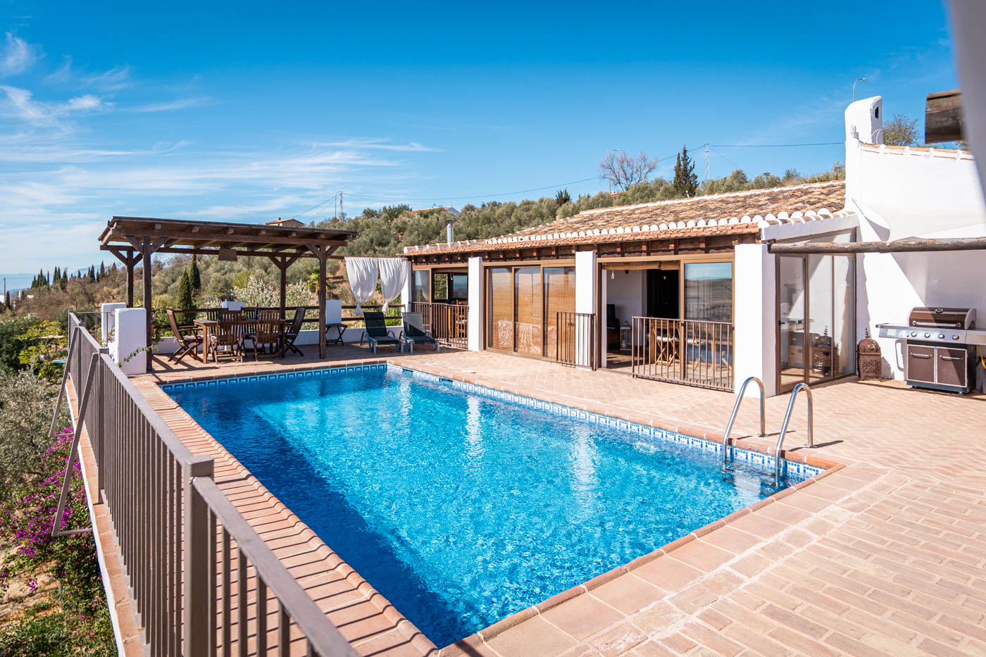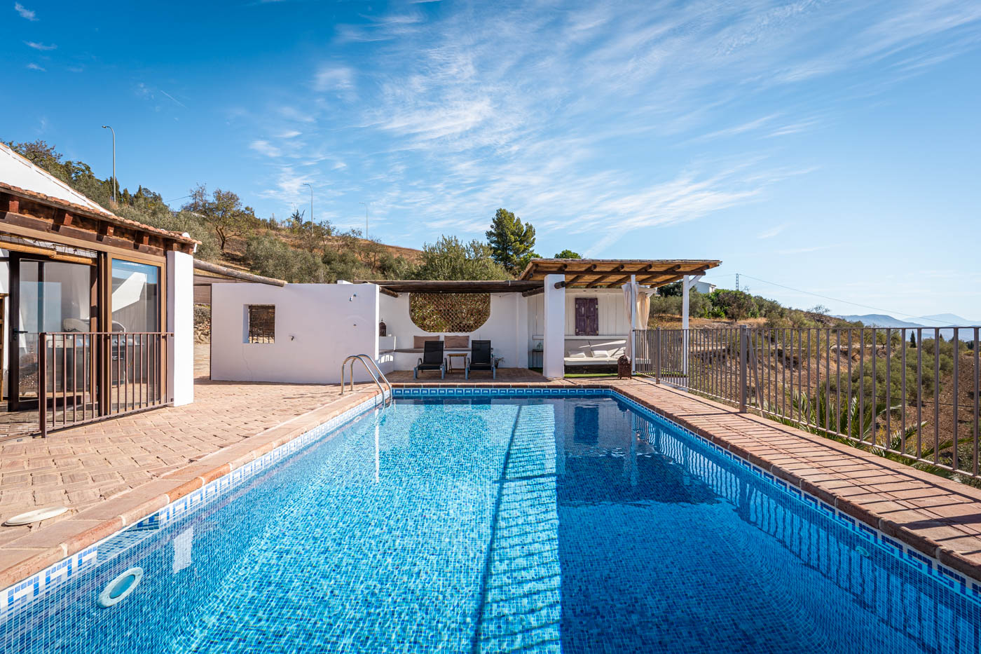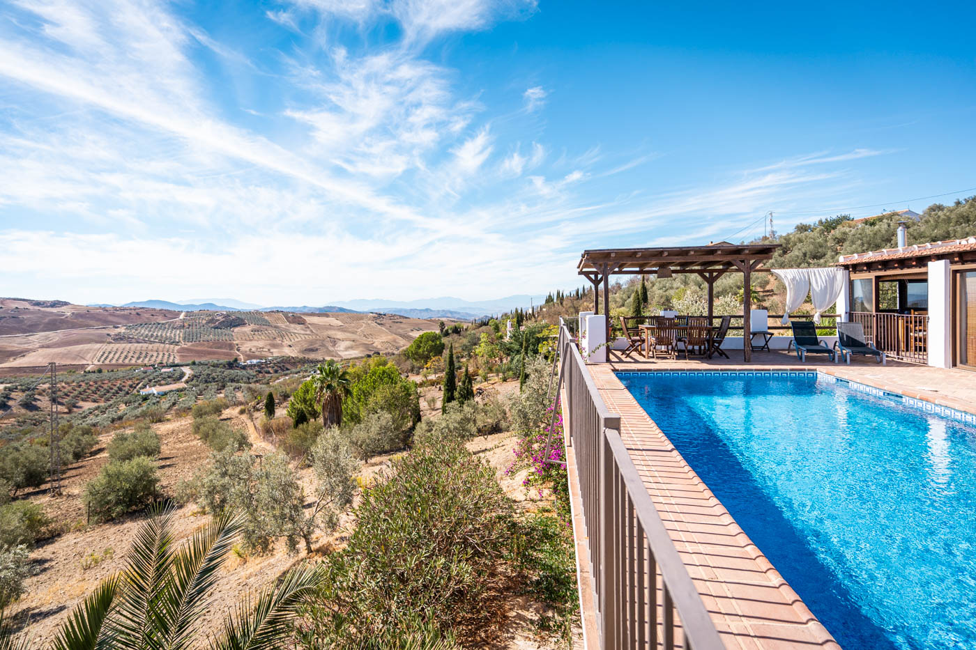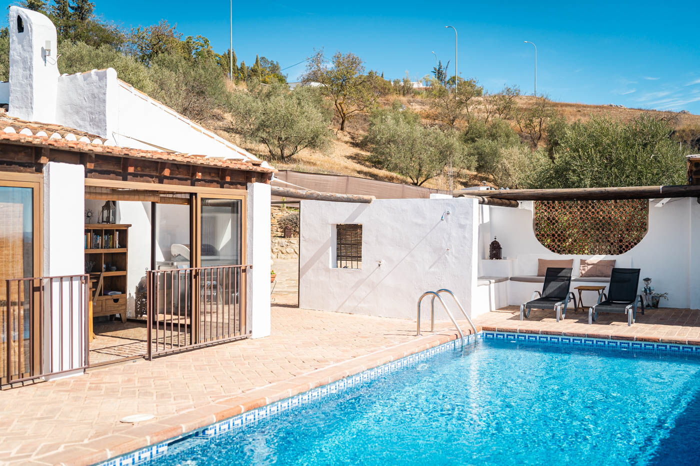 La terraza de la piscina no solo tiene una pérgola sombreada (amueblada para cuatro personas), sino que desde ella se disfruta de una vista espléndida hacia el oeste, hasta la Sierra de las Nieves. Es poco probable que uno se canse de contemplar esas colinas onduladas y plantadas de olivos. Las puestas de sol son espléndidas. Si desea cocinar en la terraza, se proporciona una barbacoa a gas.