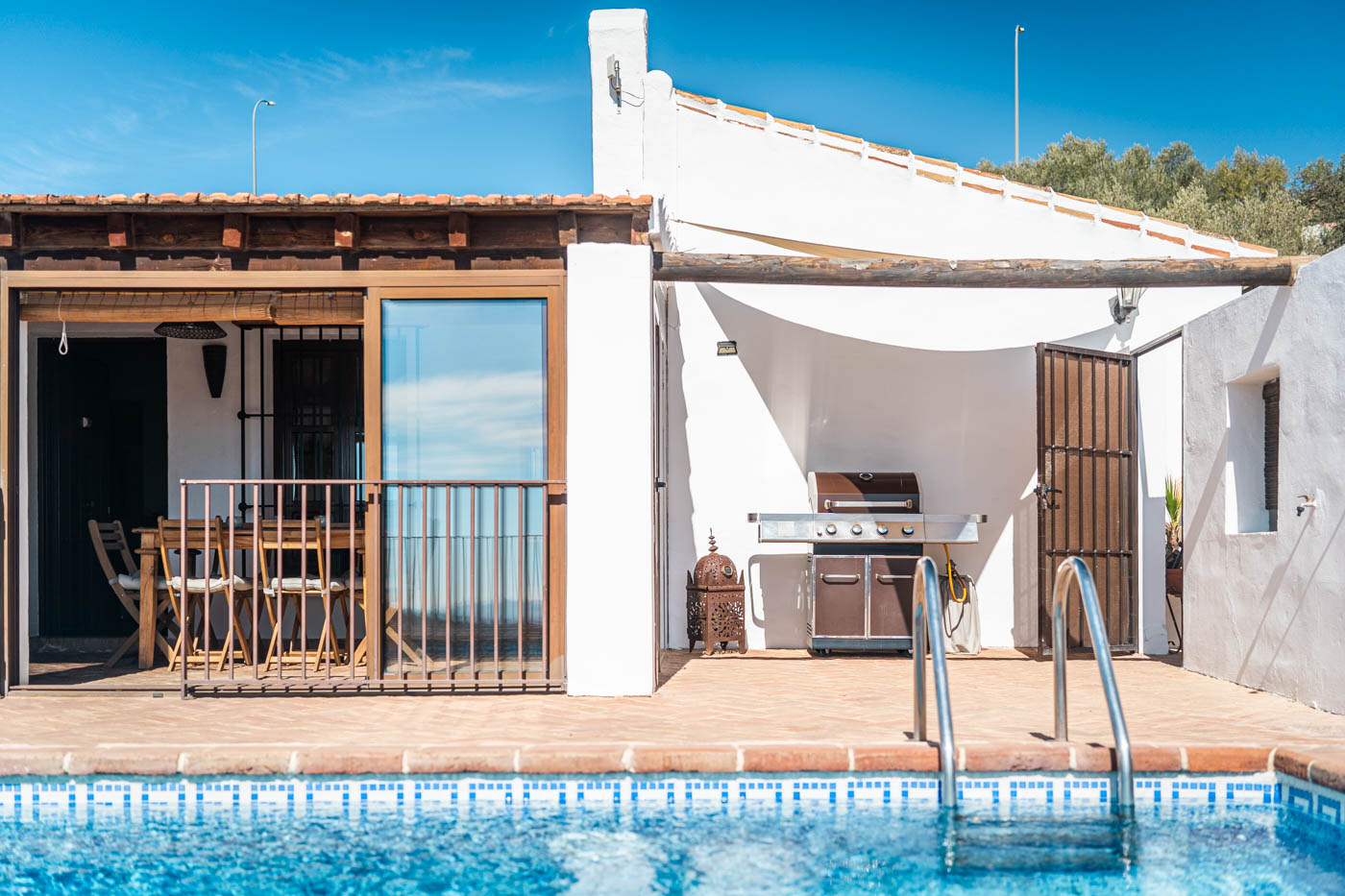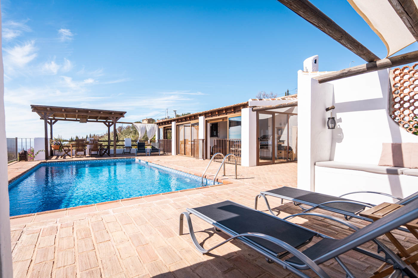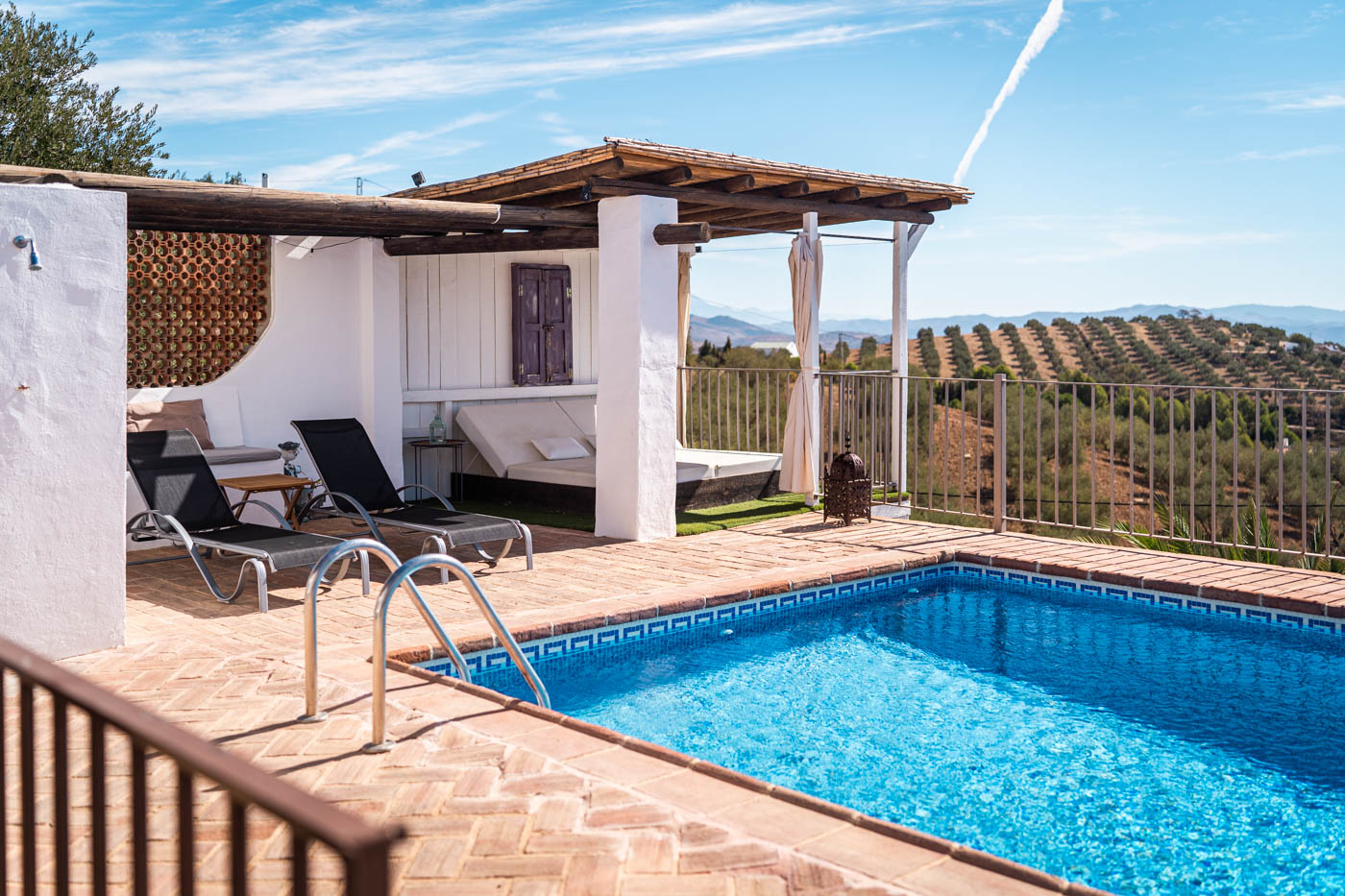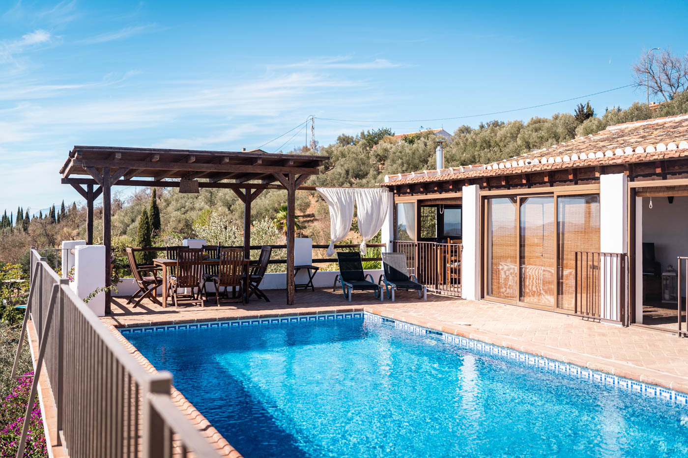 La terraza de la piscina no solo tiene una pérgola sombreada (amueblada para cuatro personas), sino que desde ella se disfruta de una vista espléndida hacia el oeste, hasta la Sierra de las Nieves. Es poco probable que uno se canse de contemplar esas colinas onduladas y plantadas de olivos. Las puestas de sol son espléndidas. Si desea cocinar en la terraza, se proporciona una barbacoa a gas.