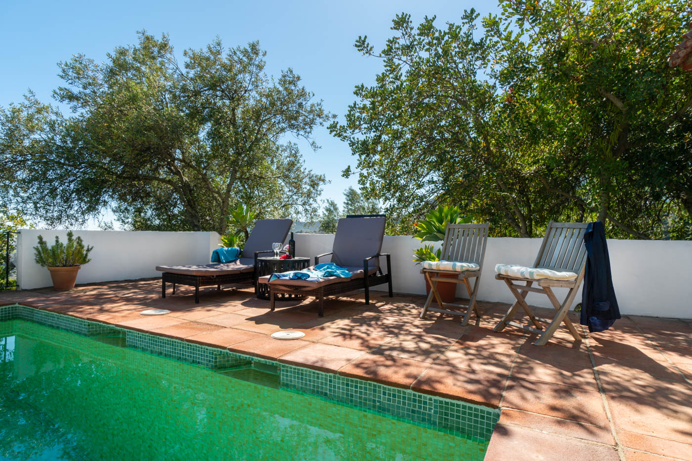 WiFi Internet (limitado, sin streaming); TV; DVD con puerto USB; CD/radio; Piscina privada (10 m x 4 m, 1,2 - 1,9 m de profundidad, con escalera romana); Terraza de la piscina; Ducha de piscina y WC; Tumbonas; Terrazas con sombra.