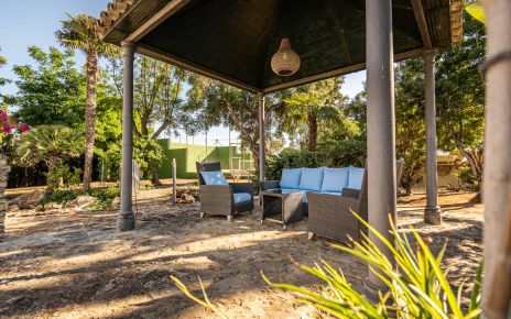 Lo que nos separa entre ambos espacios, es decir al ala este con habitaciones y salón y el ala oeste cocina y comedor es un alegre y soleado patio andaluz con mobiliario exterior, el mismo que da entrada a la casa. Aunque este espacio exterior invita ya a la relajación, es solamente un aperitivo en cuanto a espacios para vida al aire libre que nos esperan. Esta casa no solo es ideal para el descanso si no también para disfrutar en grupo en sus exteriores gracias a la casi infinita presencia del sol en esta comarca.