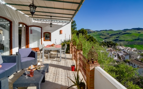 Las ventanas francesas se abren a la terraza, que es un lugar maravilloso y sombreado, con cómodos sillones y una mesa para comer al aire libre, con vistas a la montaña de Grazalema.