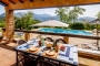 Desde un amplio estacionamiento privado, se entra en la vivienda, que es de una sola planta, con un amplio porche, que actúa a modo de una terraza sombreada, con vistas a una piscina de generosas dimensiones. Tiene una mesa de azulejos de cerámica y seis sillas para cenar al aire libre.