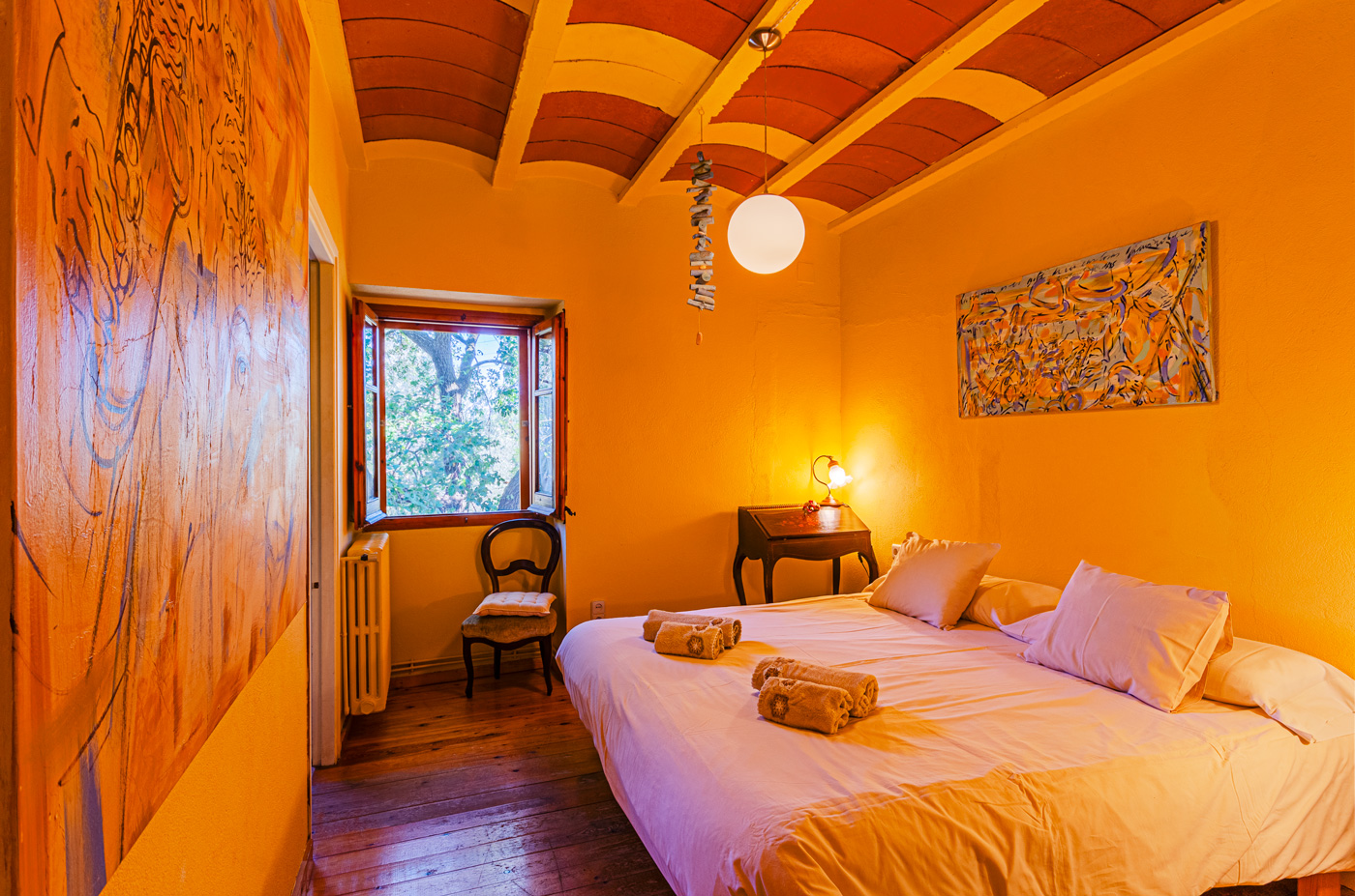 La vivienda es agradablemente informal, amueblada en un estilo ecléctico por el propietario, que es una artista, y con una variedad heterogéna de cuadros colgados en sus paredes.