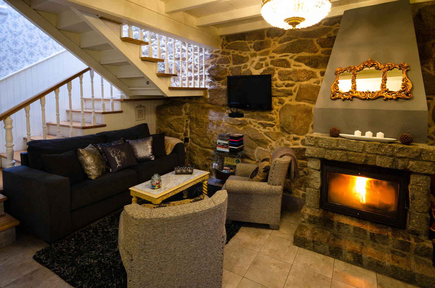 El interior de arriba es una gran habitación de techo alto, decorada con gusto. Tiene ventanas de vidrio emplomadas, espejos anchos, candelabros y una bañera antigua y utilizable. Hay un baño en suite. Dispone de una gran pantalla plana para televisión y DVD.
