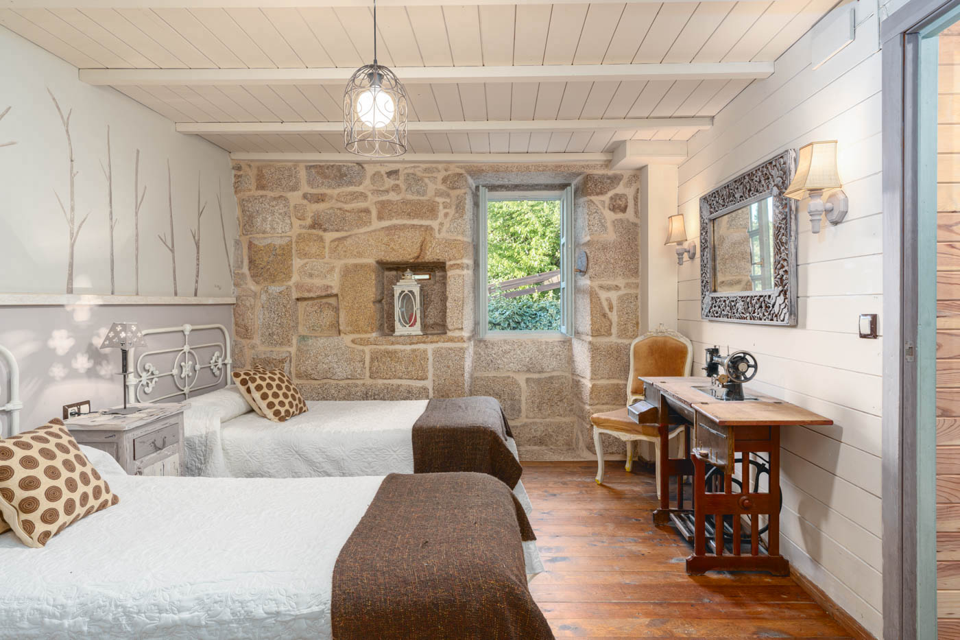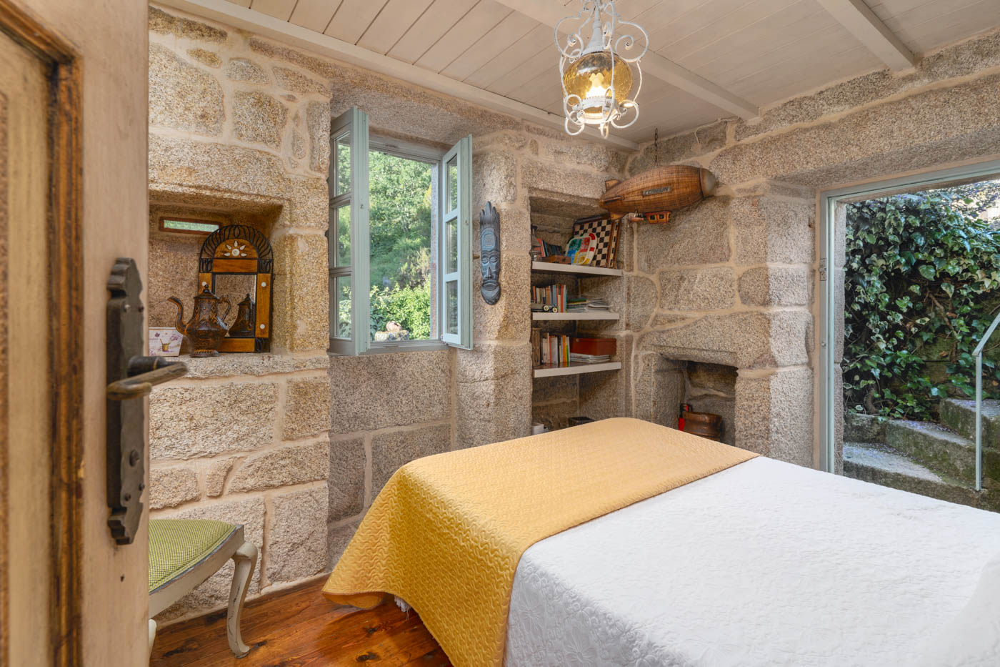La casa tiene paredes de piedra y ofrece una sensación rústica, con pisos y muebles de madera, contrastando con algunas vistosas pinturas modernistas.