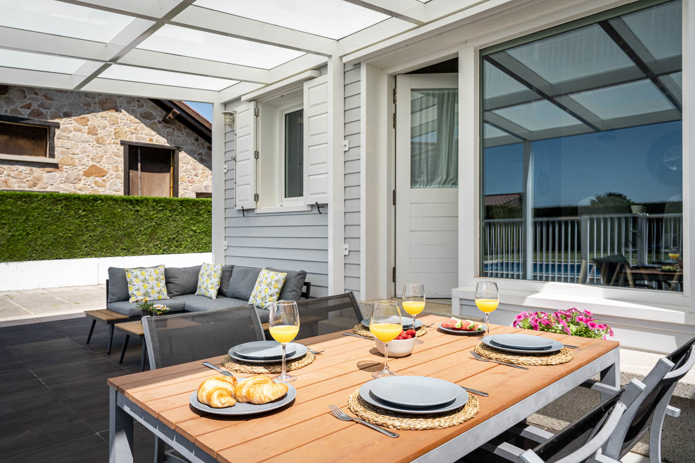 Pérgola con mobiliario exterior y puerta trasera