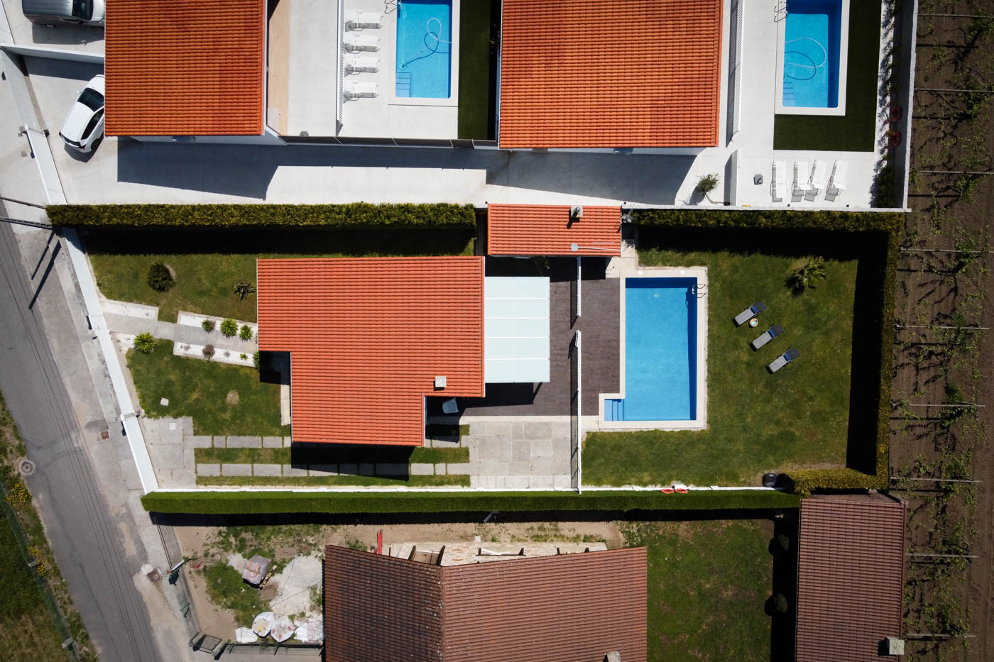 Zona delantera con aparcamiento; zona trasera con terraza, piscina y jardines.