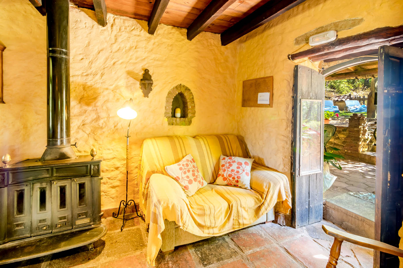 The cottage has its own intimate character with wood ceilings and floors and terracotta tiling. It is furnished simply, some original touches in the decoration making the house feel welcoming. Facilities at this sweet property are simple too. Windows fill the upstairs area with light and offer views to lovely countryside.