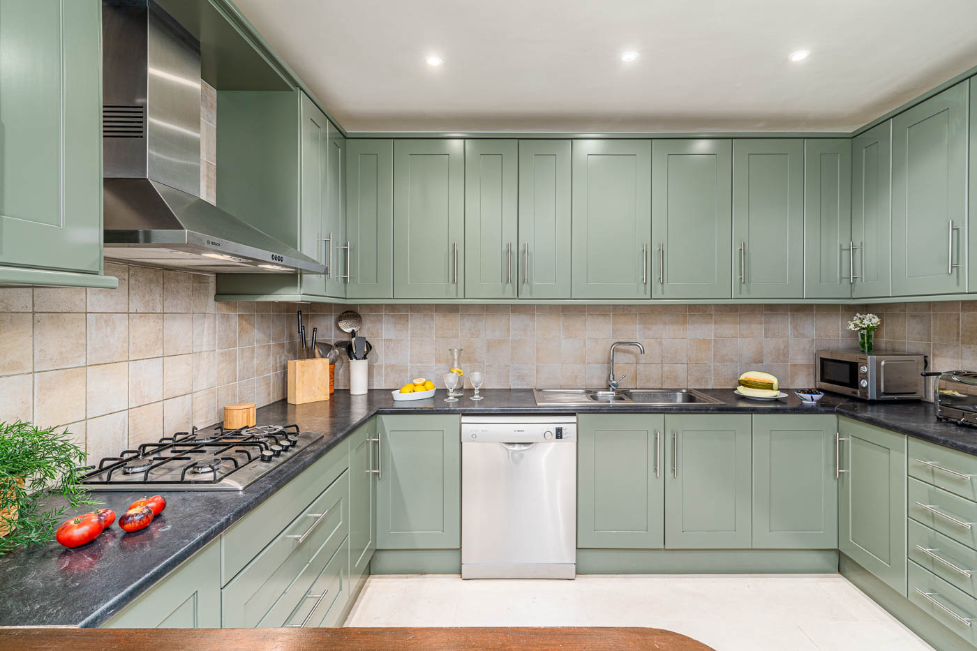 Gas hob; Ovens (2); Dishwasher; Microwave; Fridge / freezer; Kettle; Coffee makers; Toaster; Juicer; Blender.