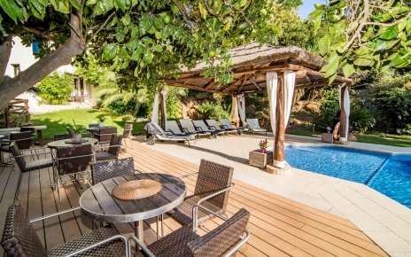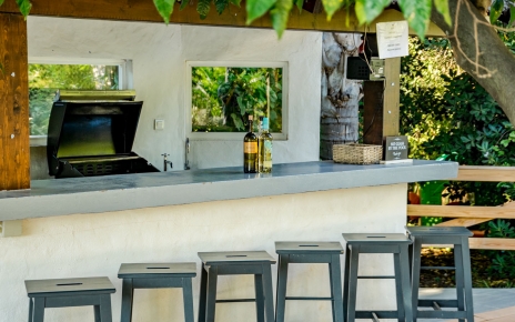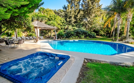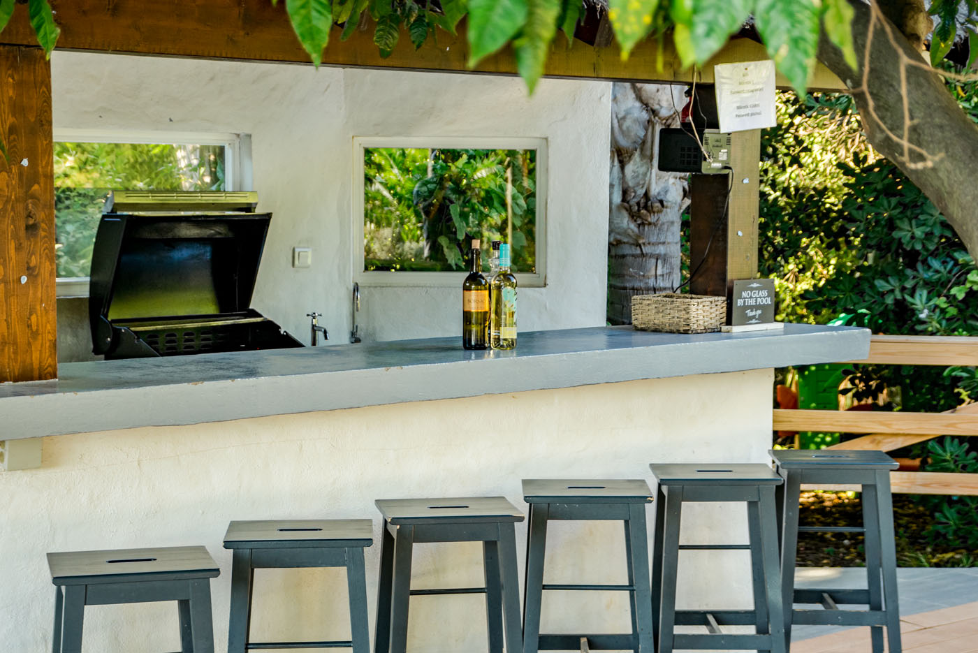 The 10 metre octagonal outdoor pool is decked around with sunbeds and an adjoining heated jacuzzi. A covered outdoor kitchen with bar features a gas BBQ, refrigerator and sink. A stately orange tree shades dining tables and bar seating.