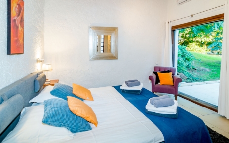 The Apartment is located on the pool level below the main villa and has its own separate entrance, but can also be accessed from inside the villa. 2 bedrooms & 2 bathrooms, it features a spacious master bedroom with en suite bath and glass door leading unto the pool garden. The studio bedroom has a kitchen, dining and living area with a spacious bathroom and washer/ dryer laundry.