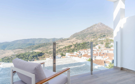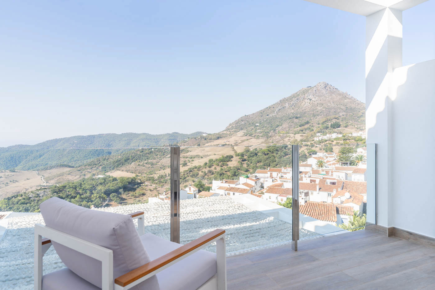 Whitewashed village on top of a hill in the Ronda mountains area with views down to the sea.