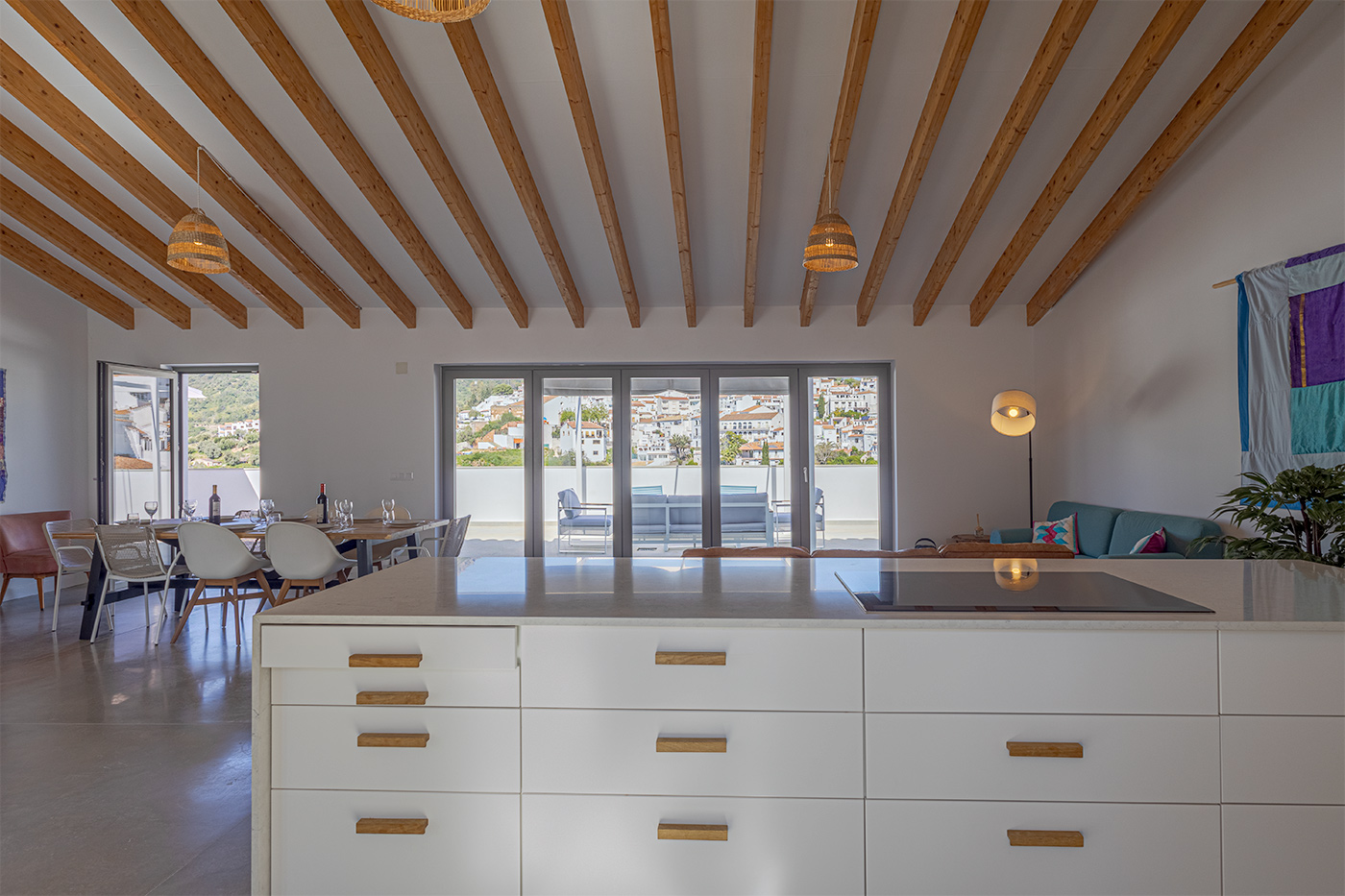 The glass door panels open onto a furnished terrace offering breathtaking views. This space is perfect for cooking, gathering, and enjoying indoor and outdoor activities. The bright and attractive design makes it a pleasant place to spend the day.