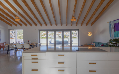The villa's standout feature is undoubtedly the upper floor, which boasts an impressive open-plan kitchen, dining, and living area.