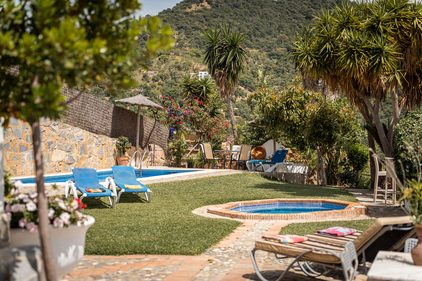 WiFi internet; TV (Spanish channels only); Private swimming pool (7 x 4 metres), Unheated outdoor jacuzzi pool; Sunloungers; Parasols; Furnished pergola; Private gardens.