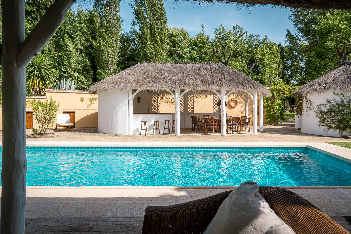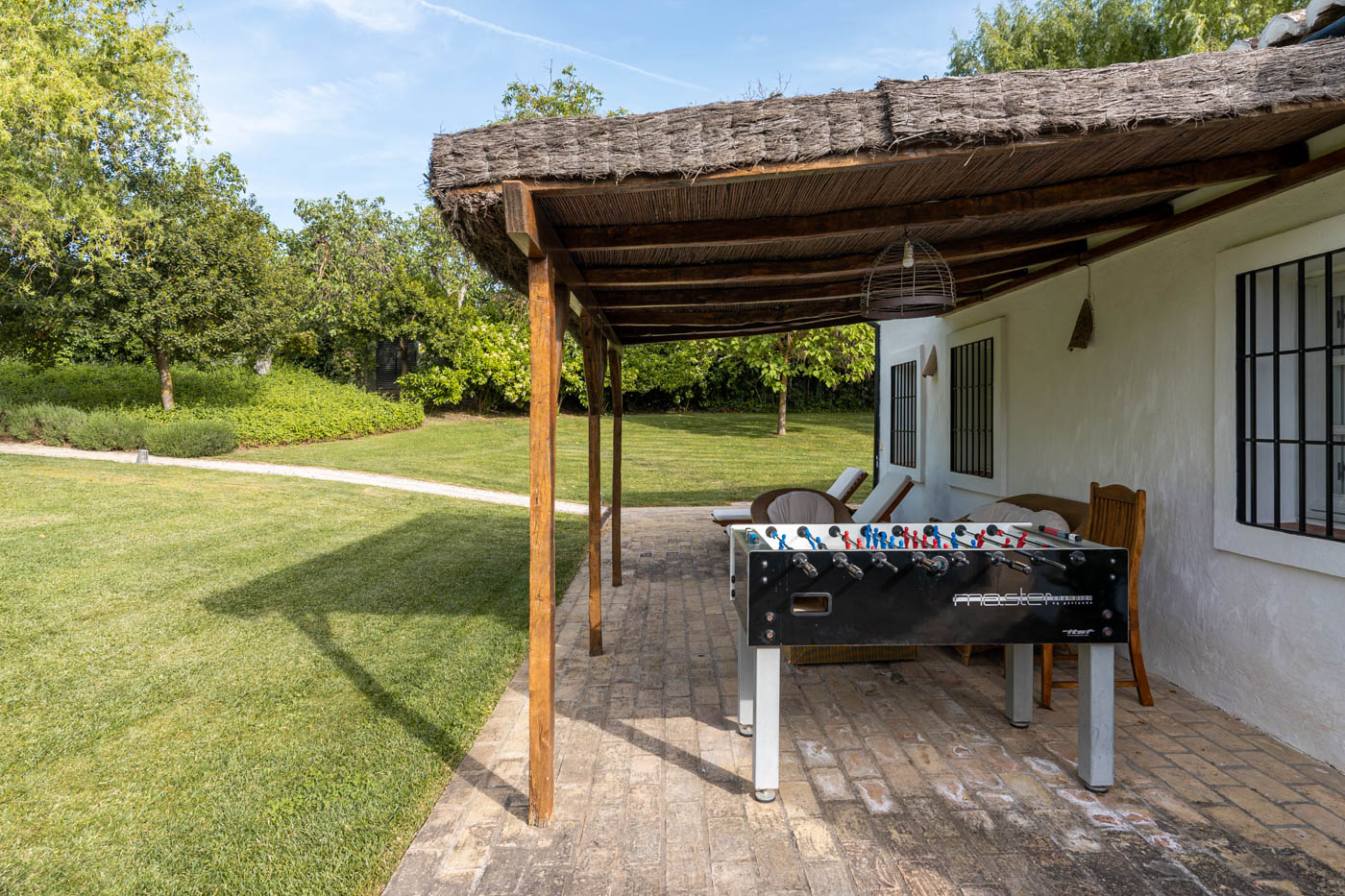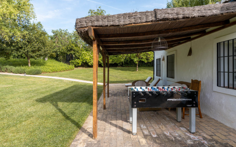 WiFi internet; Satellite TV; DVD player; CD player; Bose Wave speakers; Solar heated, private swimming pool (12 m x 6 m, 1.2 – 1.85 m deep); Padel tennis court; Sun loungers; Parasols/shade; Furnished pergola, Terraces, Private gardens; Outdoor bar and kitchen (oven and hob, two fridges), Library of books, Table tennis; Badminton