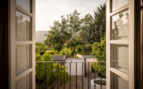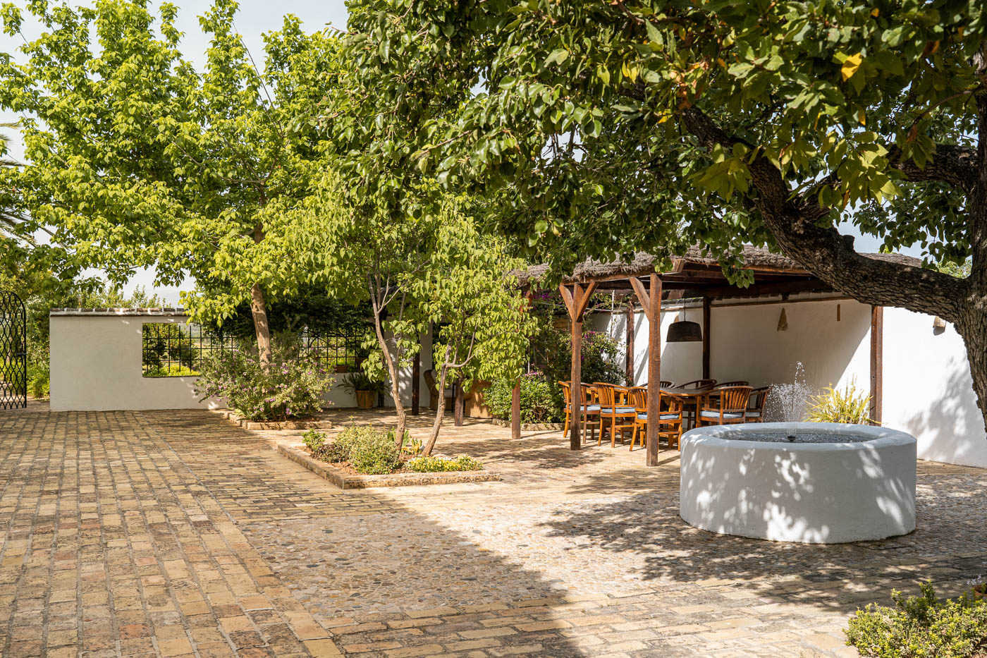 Outside there is a long colonnade on one side of the property and on the other a beautifully peaceful courtyard planted with trees and at the centre a fountain. Choose either spot to sit, in the morning for breakfast, or in the evening listening to the calming sound of water trickling from the fountain. Simply enjoying the views across the gardens and beyond … what a glorious place to be!