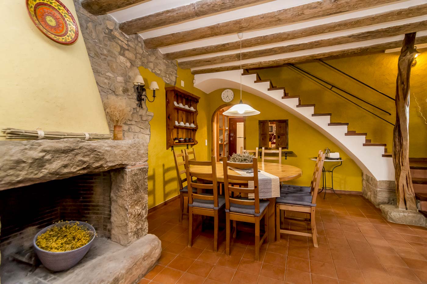 This old stone farmhouse is adorned with cheery yellow walls, exposed brick and beam, and warm terracotta colors. The house boasts plenty of curves and magical corners set out across two floors with four attractive bedrooms.