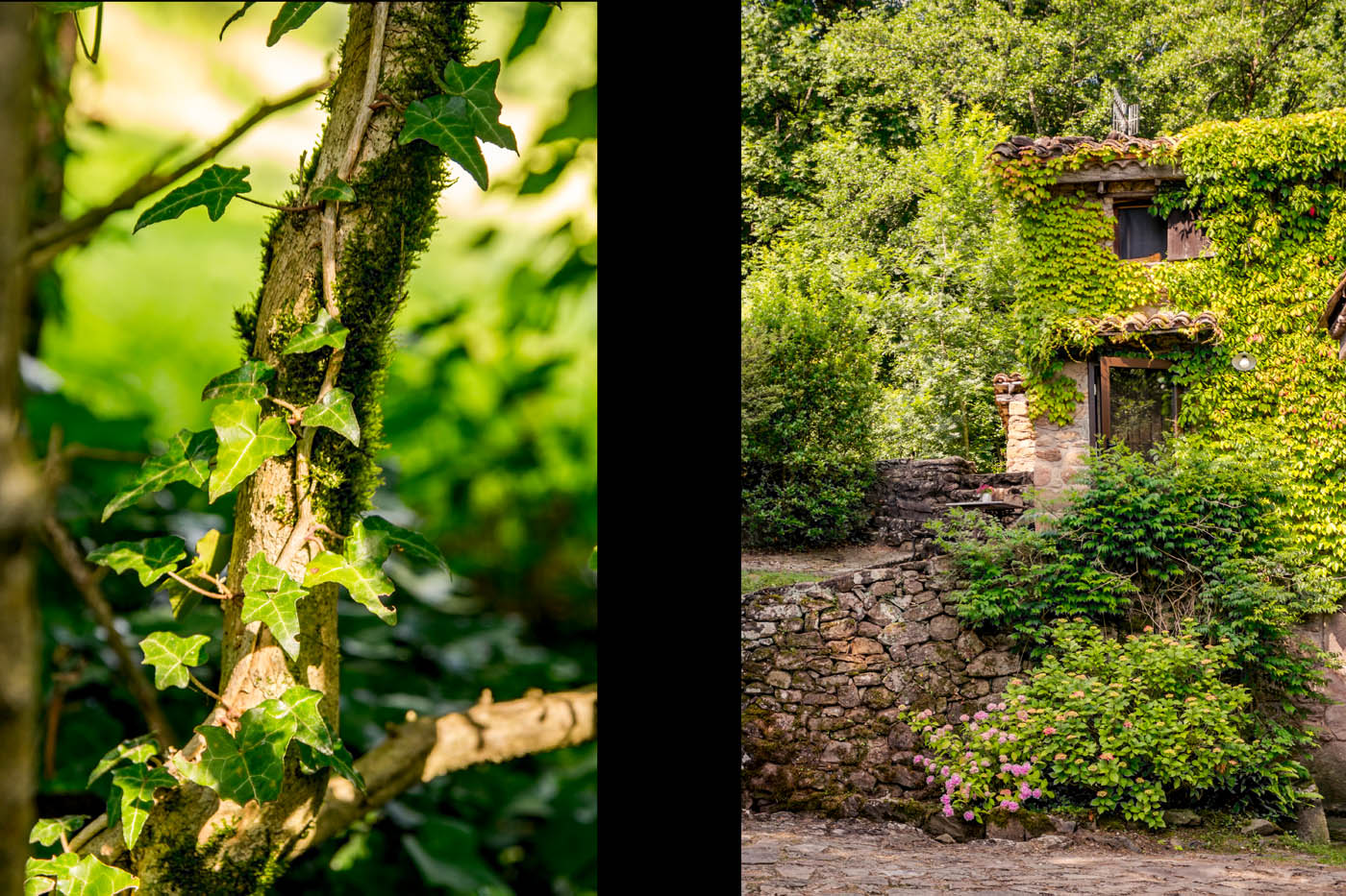 The property is reached down a slightly idyllic driveway which opens to plenty of privacy within large gardens. A wooden bridge crosses a stream. There's a pool of mountain water (for natural swims) and deeply serene hillside all around.