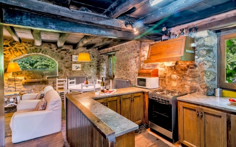 The main entrance leads directly into a lovely rustic kitchen and living quarters: a stone-walled, wood-beamed living and dining room. It accommodates four people comfortably and extra chairs can be provided to allow everyone to eat together if one or more of you is staying in the casita bedroom.