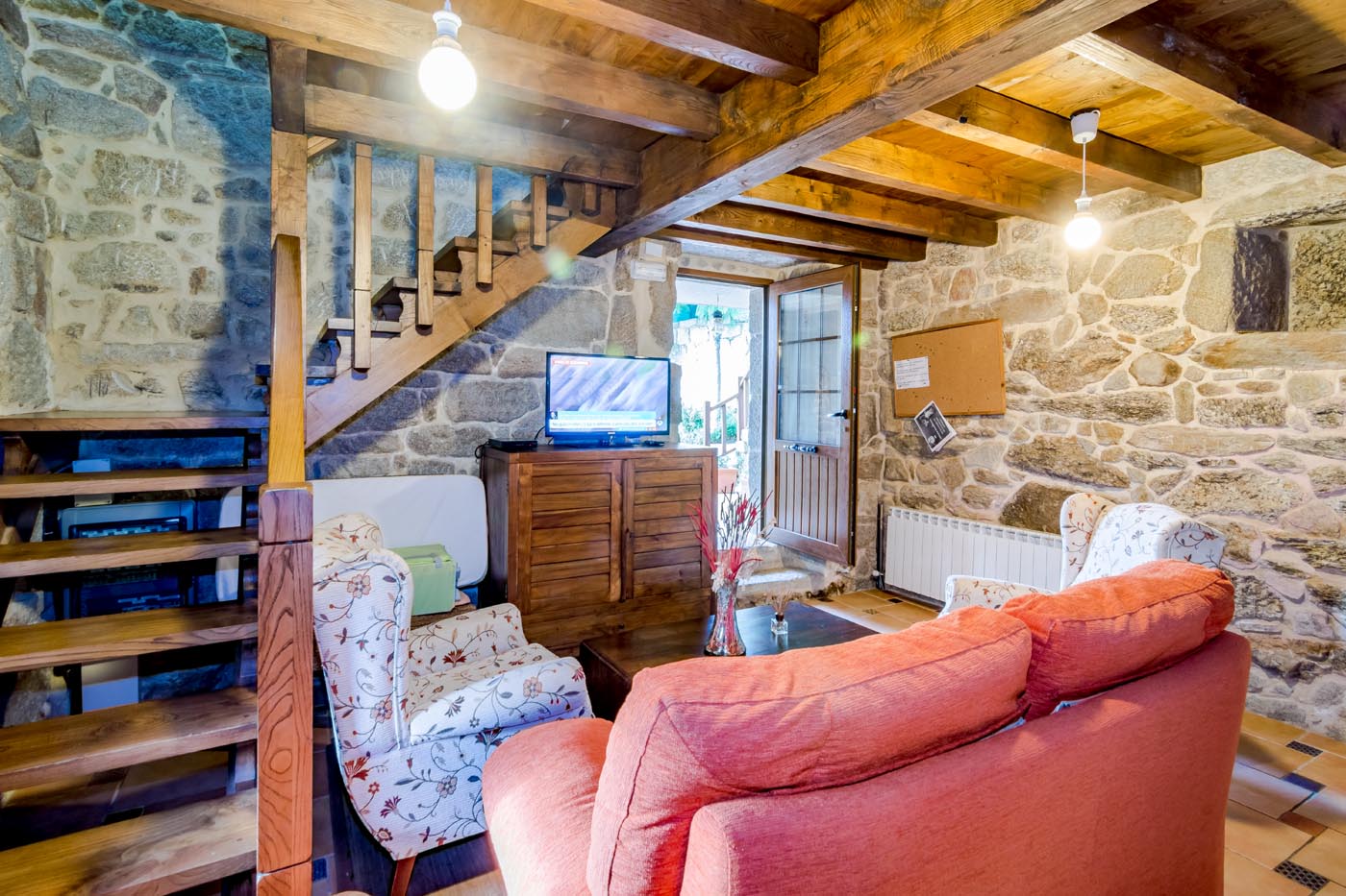 The kitchen is adjacent but independent from the rest of the house. The living room has wooden stairs up to the bedrooms, which are also accessed from an outdoor stone staircase: generally speaking, an easier and nicer way of getting to and fro.